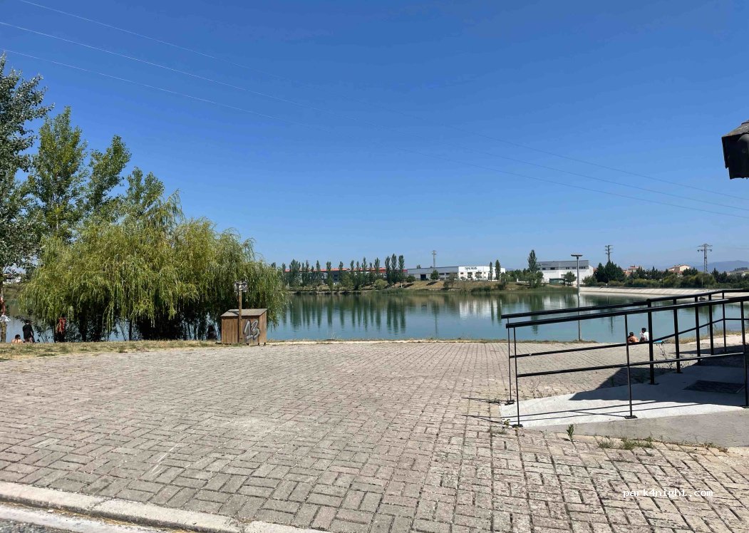 The surrounding area is an industrial area and not particularly beautiful. But this place is really cozy and located on a beautiful lake where you can spend a nice day swimming in the summer. Many locals use this lake for swimming, fishing or SUP. There is a clean public toilet and trash can, perfect for an overnight stay near Pamplona. A nice bar/restaurant with breakfast (07:30-16:00) is right around the corner.
