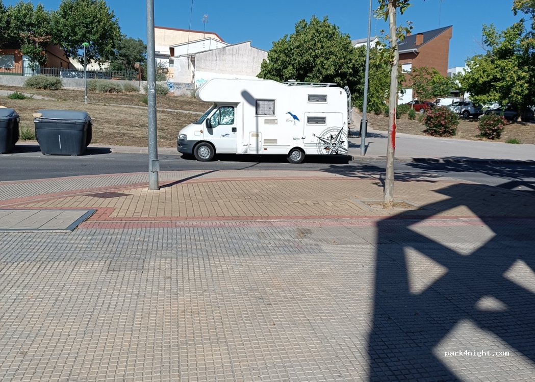 Quiet place in front of the park. Level ground. We stopped for the night. The town looks safe. It is small but the neighborhood is pleasant. The av. from Madrid crosses the town from end to end.