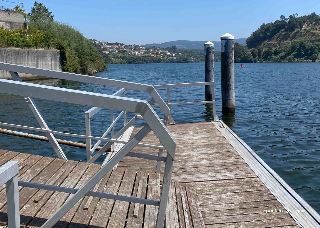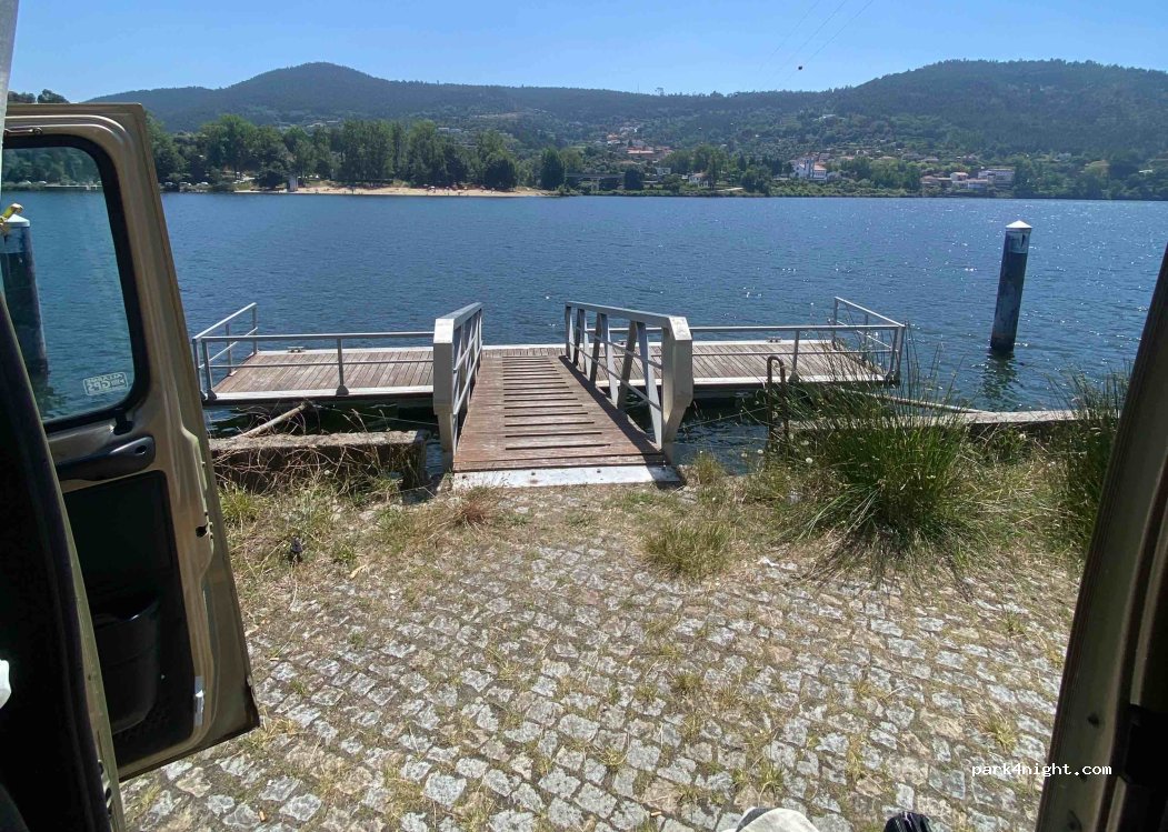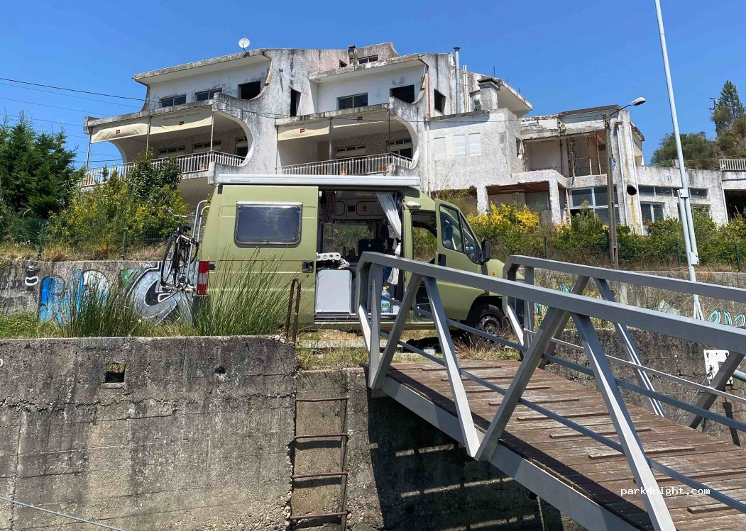 Beautiful spot next to the river to stop for a lunch/picknick/break. Next to the abandoned hotel at the roadside there is a small street leading down to a dock at the water. Space for a about 3 vans to park and there is a dock where you can sit/fish. You can also enter the water to swim or even put a canoe/kayak in the water.