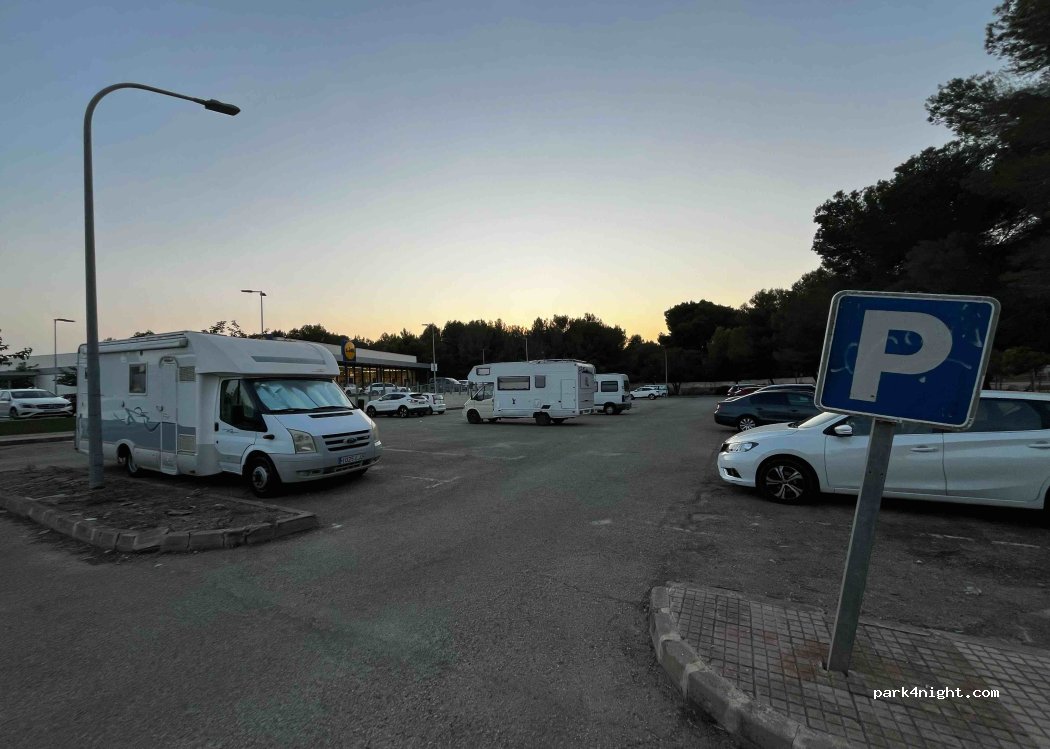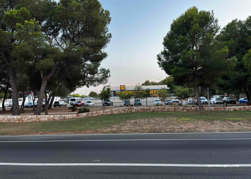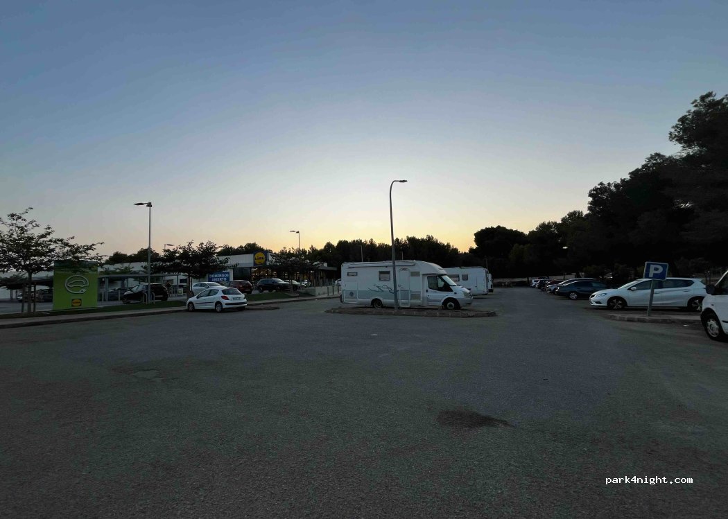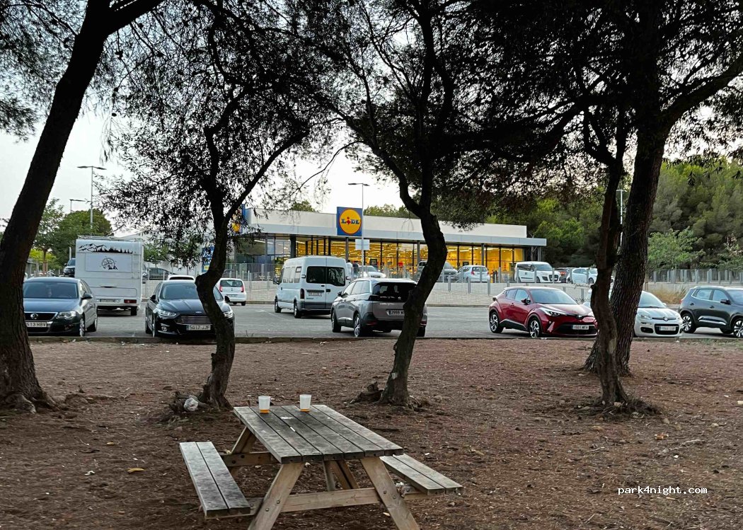 Public parking next to a Lidl, it is not the same parking lot as the Lidl. There are about 30 places, a picnic area with some trees next to it. No shade in the parking lot. Main road nearby, so there is some car noise, but nothing special. Good option to spend a night and continue. Possibility of using Lidl toilets during opening hours.