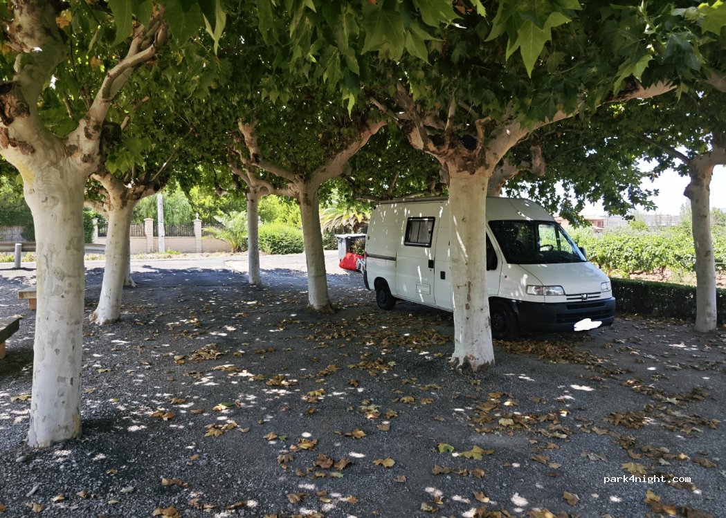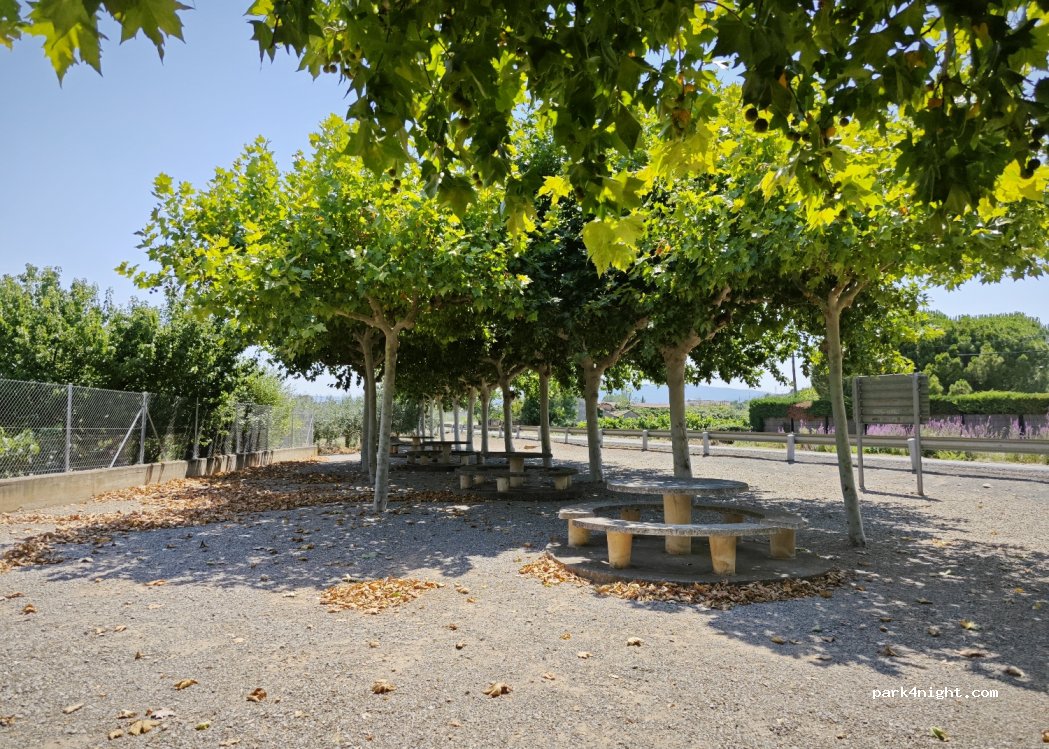 Aire de pique-nique en bord de route avec plusieurs tables et sièges en pierre, le tout à l'ombre. Source d'eau potable. Peu de places de parking mais toutes à l'ombre.