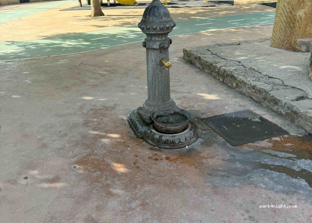 Drinking water fountain, inside a playground, but accessible by hose if you park next to the fountain. The pressure is good, and it gives us the option to refill the tank. It is water connected to the public network, therefore we know that it is good quality.