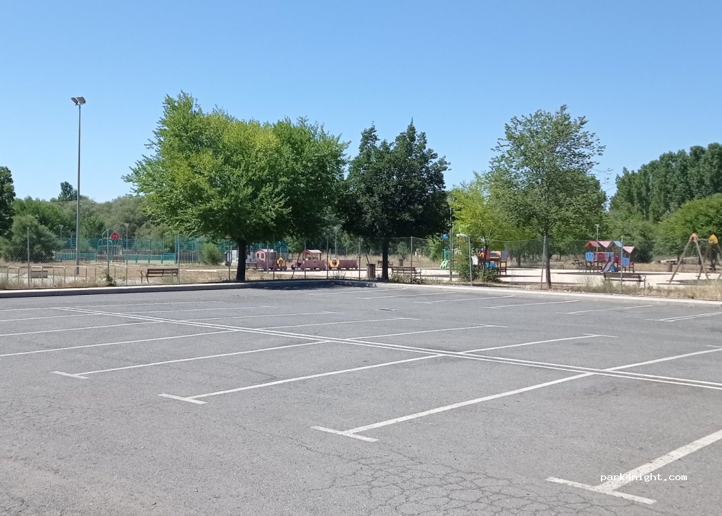 Twenty-two parking spaces next to a children's playground with a fountain. It is next to an industrial estate and has streetlights. very close to the road and very easy access. There are shady trees. We have only used it for eating but I am sure it can be very good for sleeping. It is well leveled. very close to the Parque del Soto recreational area. ideal for children.