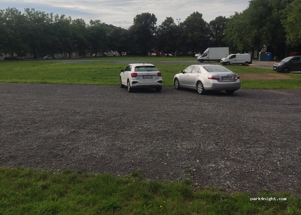 Einfacher, grosser Parkplatz umringt von Bäumen und mittig eine große Rasenfläche. Kostenfrei. Keine Verbotsschilder. 10 Minuten fussläufig vom kleinen Stadtzentrum entfernt. Ruhig. Keinerlei Serviceleistungen. Gelände leicht geneigt. Für eine Nacht ok