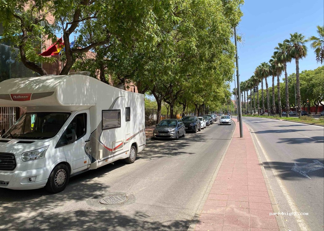 On both sides of this avenue there are side streets with plenty of space under tall and large trees. Shade in the morning and afternoon, ideal in summer. There is often space. I would not sleep there because it is next to the avenue, but 7 minutes by bike from the center (20 on foot) and 10 from the swimming pool with cycle path. Free. Park well against the sidewalk because buses pass in the side street. But no problem with a 2.35m wide camper van. No security problems (especially opposite the Murcia archives center). Ideal for enjoying the city.