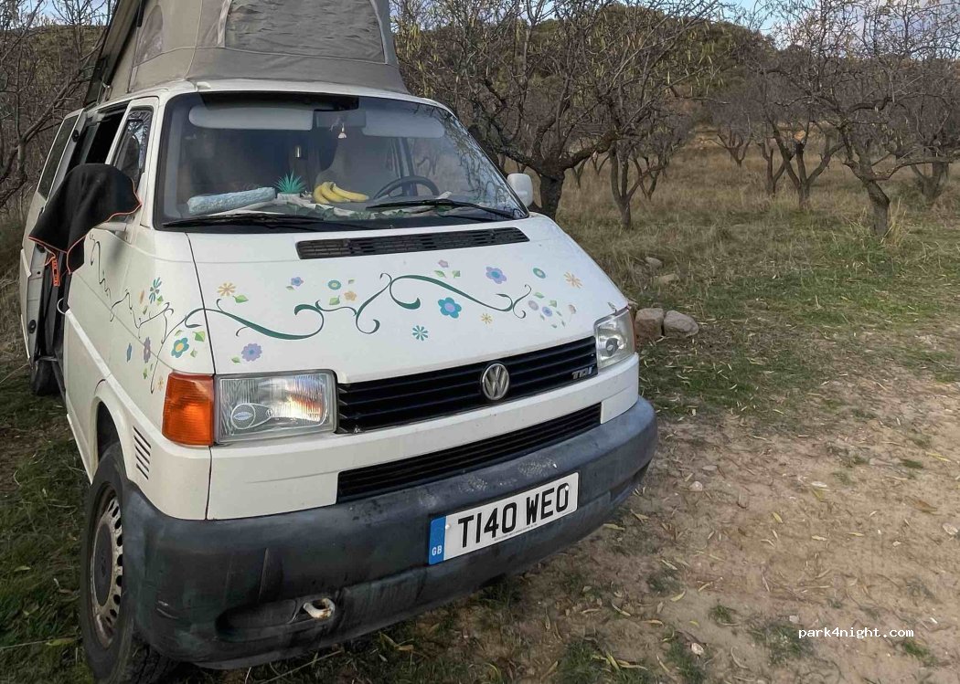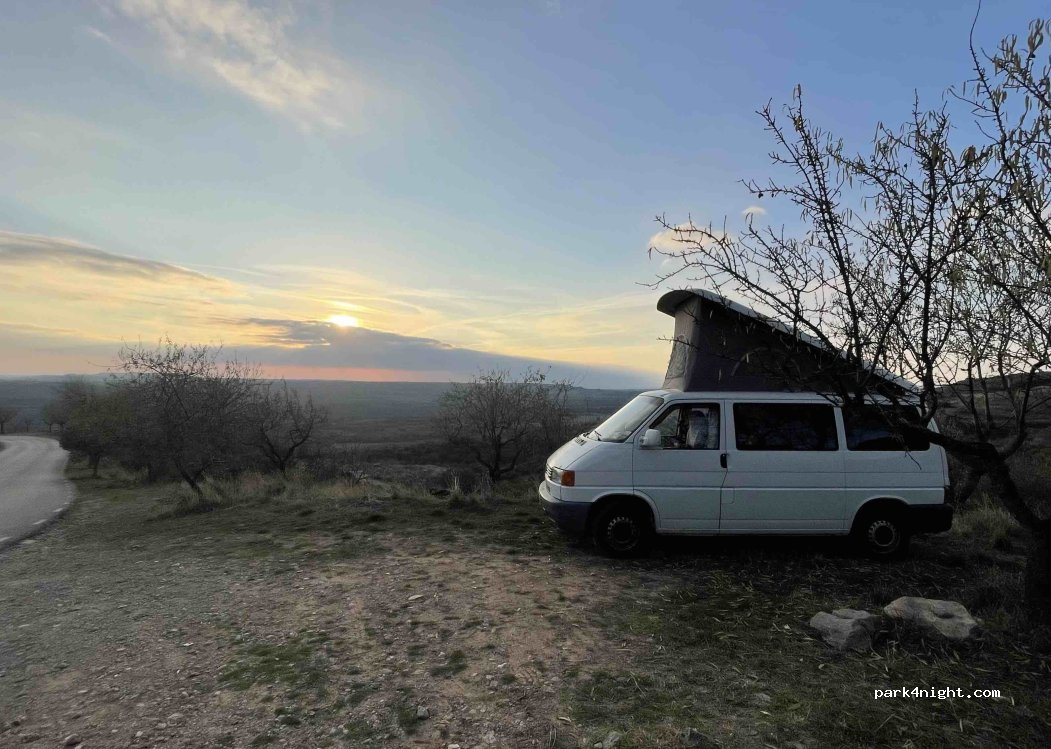 Small esplanade next to some fields and the road, in the morning quite busy with bulls from tourists who go to visit Alquézar. This place is a few meters from the parking lot where you cannot spend the night and, therefore, close to the center of Alquézar. Warning: there are many mosquitoes and it is very hot (August) ???