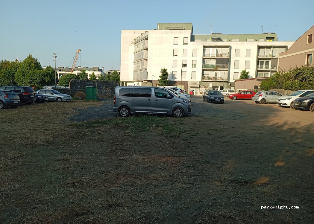 Parking de tierra algo desnivelado. En la parte del final caben algunas autocaravanas grandes.