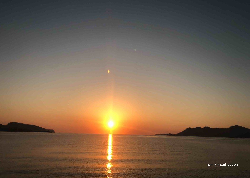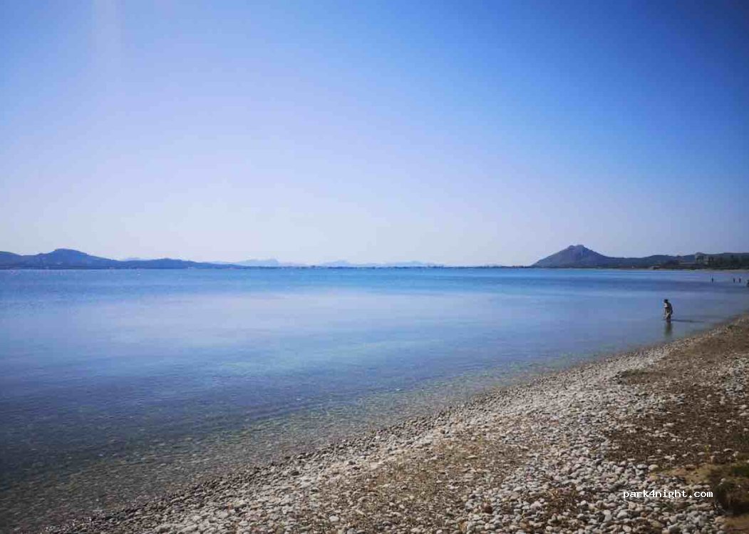 Quiet place next to the road, not very busy at night. No blue zone. Several motorhomes parked in a row. Quiet area with a pebble beach along the entire road. Crystal clear water with some trees. Perfect place to watch the sunrise and with excellent views.