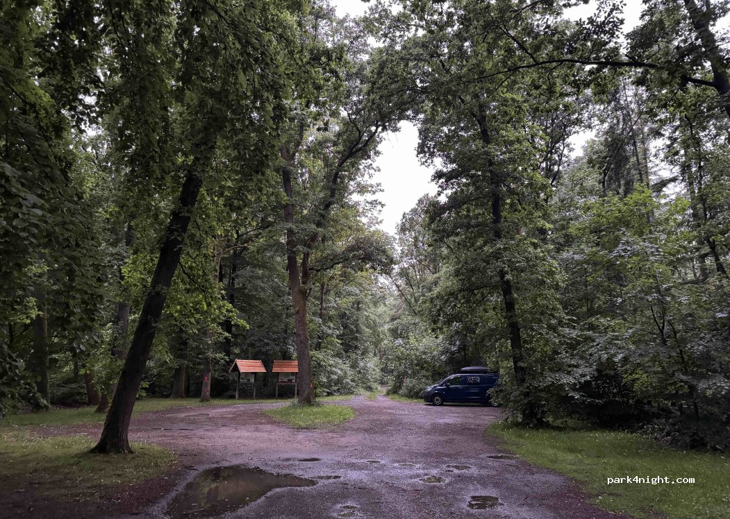 Very nice Spot, I was undisturbed and even stayed until the late afternoon on the next day to do some work. Good internet connection. It’s right next to a busy road, but the traffic started again at approximately 6am. I liked it very much and will probably stay there again, because I’m currently in the area. The forests around it are beautiful and worth wandering through. I’m sure one night is ok.