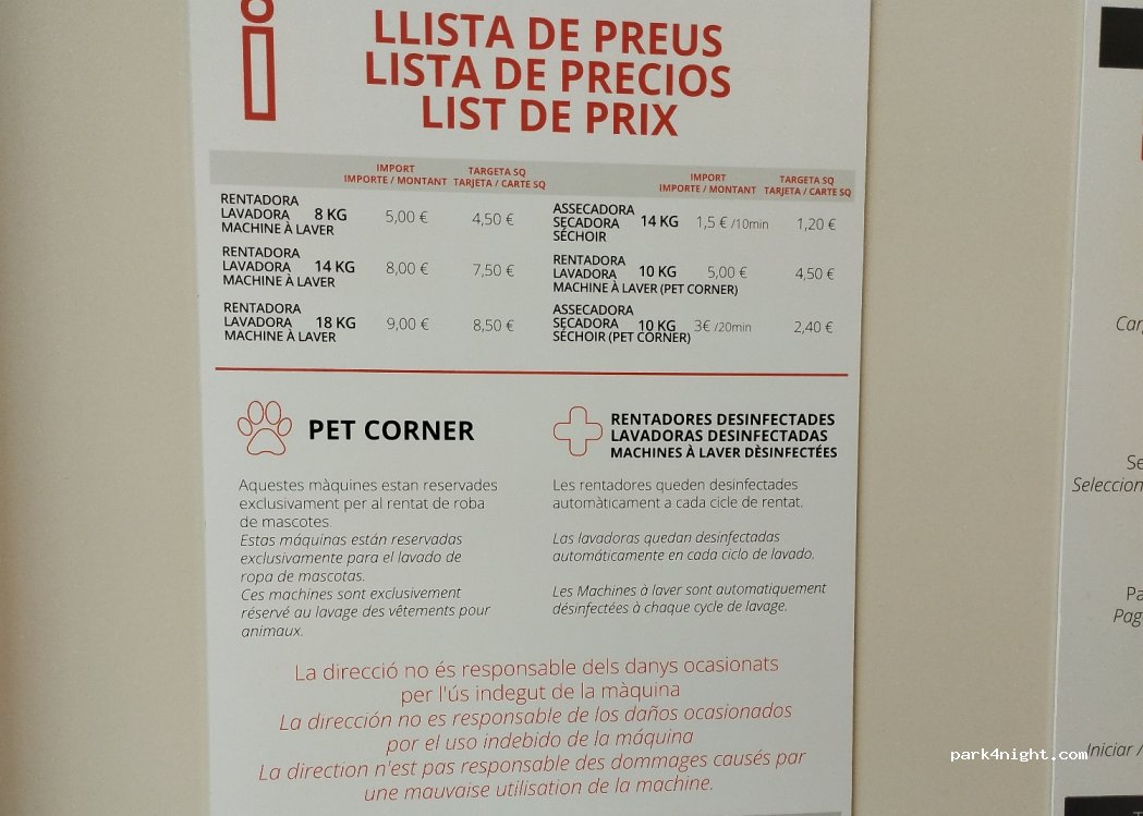 laverie très propre . lessive et assouplissant intégrés dans chaque machine . une machine à laver et un séchoir prévus pour les accessoires des animaux en plus des 5 laves linge et des 4 sèches linge.... merci beaucoup.
