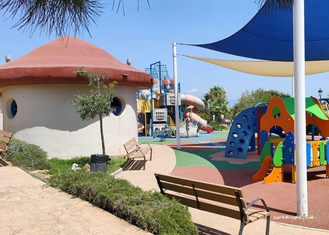 Parc de jeux pour enfants public, avec des sanitaires propres, 3 fontaines à eau, des poubelles, des tables pour pique-niquer.
