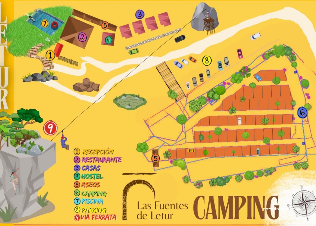 El entorno es genial, está situado en medio de un paraje natural, a 10 minutos andando de Letur. Ambiente familiar y seguro. Con piscina, restaurante, parque infantil y un montón de actividades. El mejor de zona.