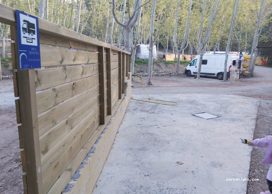 camping súper tranquilo con baños duchas aseos vaciado y llenado el vaciado de aguas negras no lo vimos posible no habría , agua y luz en la misma parcela hay un restaurante y piscina y pasa el río por la parte de abajo del camping en verano imagino habrá más gente y puedes ir caminando asta el pueblo por el mismo cauce del río dando un paseo muy bonito porque esta a unos 10 minutos