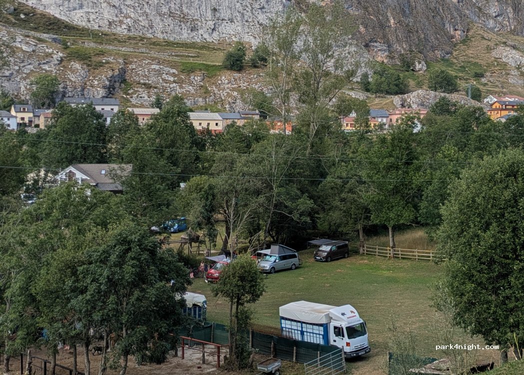 Charming Camping in a stunning valley of the Somiedo natural park. Water hose to fill up, and electrical hook-up. Not recommended for large vehicles as the road up the valley is very narrow and windy. Staff is friendly, there is a small bar with delicious local apple cider, laundromat available, showers, toilets, and a good spot to start horse excursions and hikes.