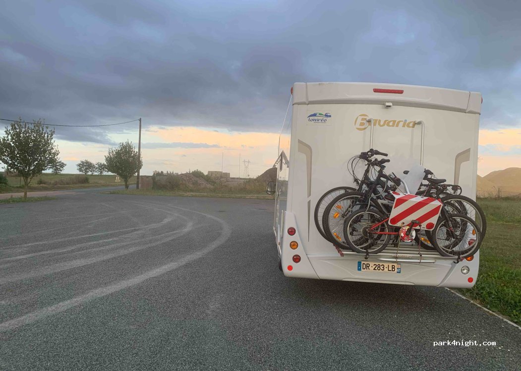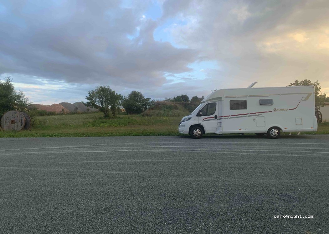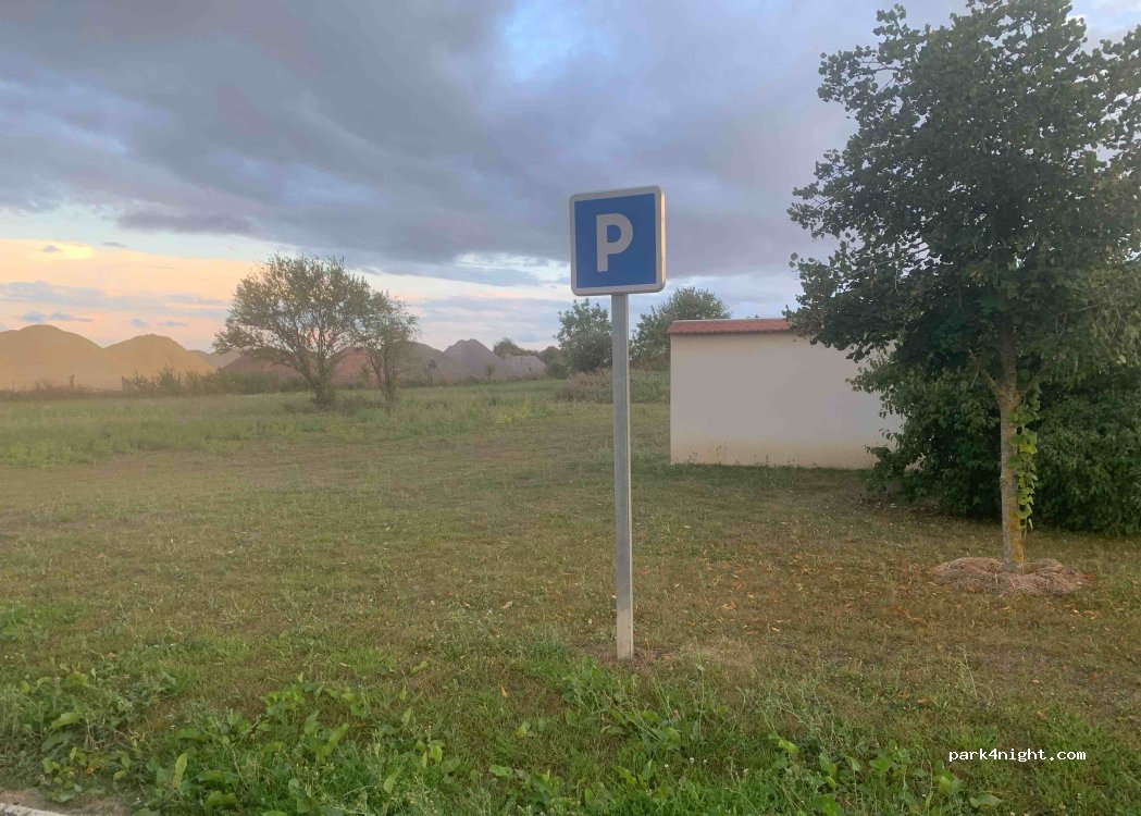 Stationnement du cimetière. Grand parking en gravier, assez plat. Panneau annonçant des travaux d'agrandissement du cimetière, mais pour l'instant tout va bien.