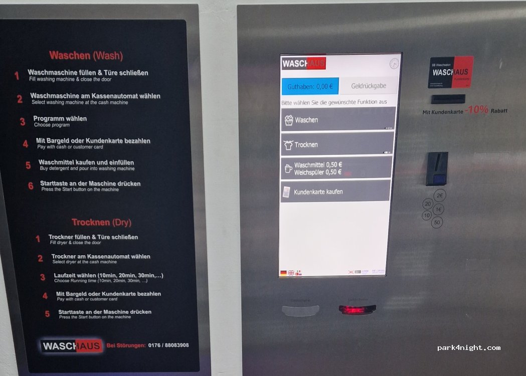 Laverie automatique, aire de jeux juste à côté et possibilités de stationnement dans les rues environnantes (par exemple Paulusstrasse juste à côté de l'aire de jeux). Il y a également deux places de parking clients directement devant la laverie, mais davantage pour les petits camions. Vous pouvez apporter votre propre lessive ou l'acheter, paiement uniquement en espèces (billets et pièces).