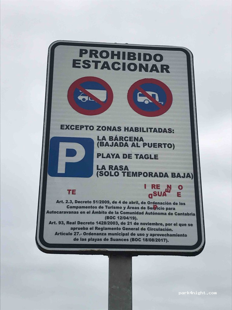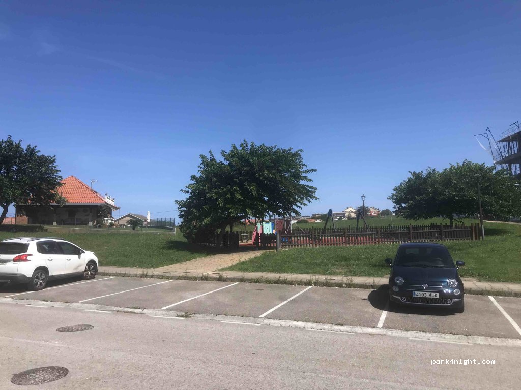 Se aparca en la Calle La Rasa, la zona más alejada de la carretera está llana. Sitio muy tranquilo por la noche, por el día hay una obra de un edificio. Los perros pasean a sus dueños, se ve un sitio seguro. Buen lugar para ir de ruta a conocer Suances, la Ermita de Santa Justa, etc. Zonas verdes con bancos y juegos infantiles.