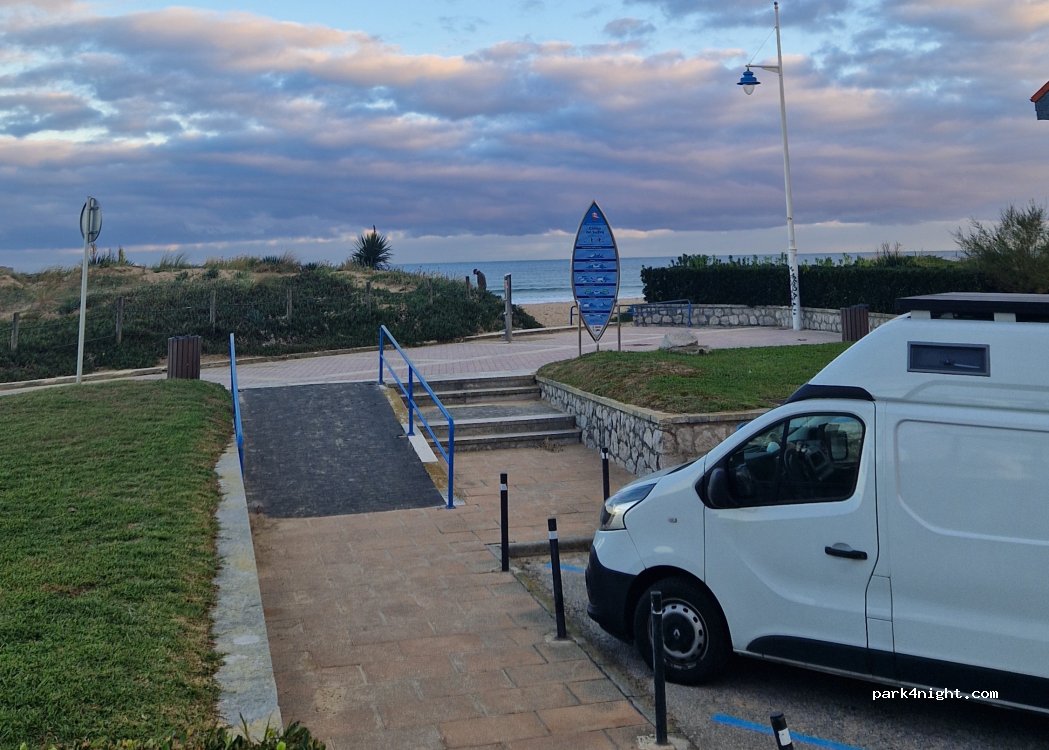 It is a street that you can park and sleep quietly, but only Park not camping, I Park two nights and without problems, is full of ac and all vans parked and not camping, if you respect that without problems, have the beach side and beach showers and services. Recommended site. Best regards.