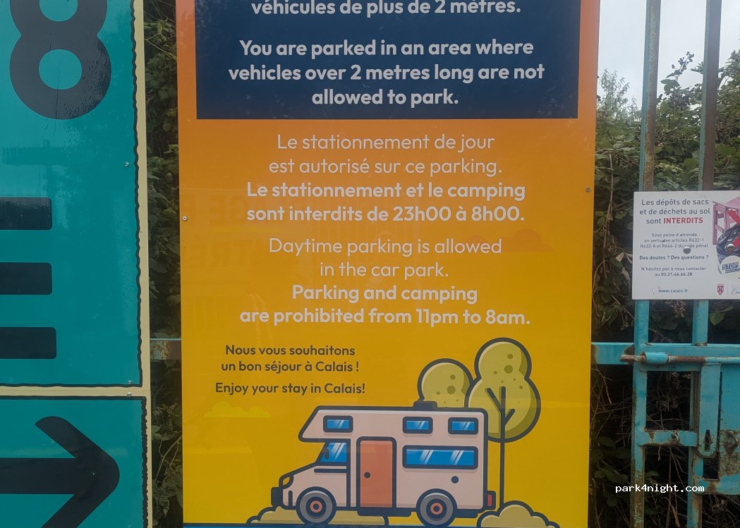 very large car park on edge of calais. no barrier (barrier permanently up) and was completely empty when I visited.