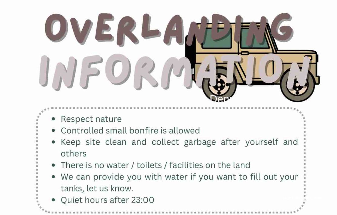 Only for 4x4 vehicles, 18 ha of our private land ~ we want to make accessible for you! Please visit us :) it’s only for 4x4 cars, as it’s purely in the nature, there is privacy and we will make sure to keep the overlanding a nice nature experience. You can find our adventures on instagram where a movie of the land is available. WhatsApp - let us know that you arrive