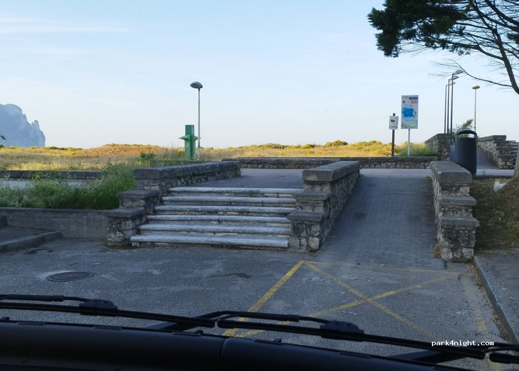 Quiet area next to a park. Fountain in the park. Very quiet you can stay overnight without problems. We slept several motorhomes together. Beach 200 meters.