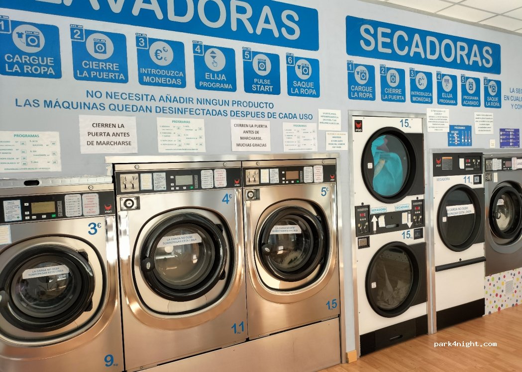 Lavandería con lavadoras y secadoras para hacer la colada. No es difícil estacionar en las inmediaciones.