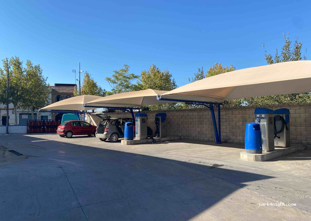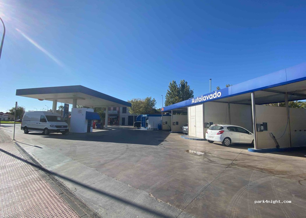 Station gazole avec possibilité de lavage pour camping car avec rampes, aspirateur, air comprimé pour les pneus. Pas de d’eau pour remplir. En face un supermarché DIA avec machines à laver le linge
