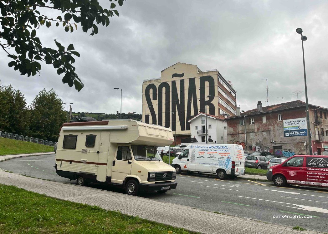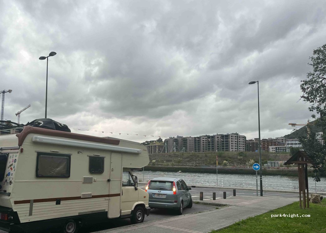 Paying parking from 9-13:30 and from 15:00-19:00. A bit steep, but you can find a less steep parking spot. We spent the previous day in the parking lot of the San Mamés stadium, a safe area. This area has a green area, people walking around the river. At night there are fewer cars. Less noise than in front of the stadium. Since it is difficult to park in Bilbao, it is a good option. Close to the center on foot. However, be careful, we took a long detour following the Nervión River, to avoid a 2.7m tunnel. There are public toilets nearby. Safe, (but you always have to be careful) and with lots of local, family and tourist passers-by.