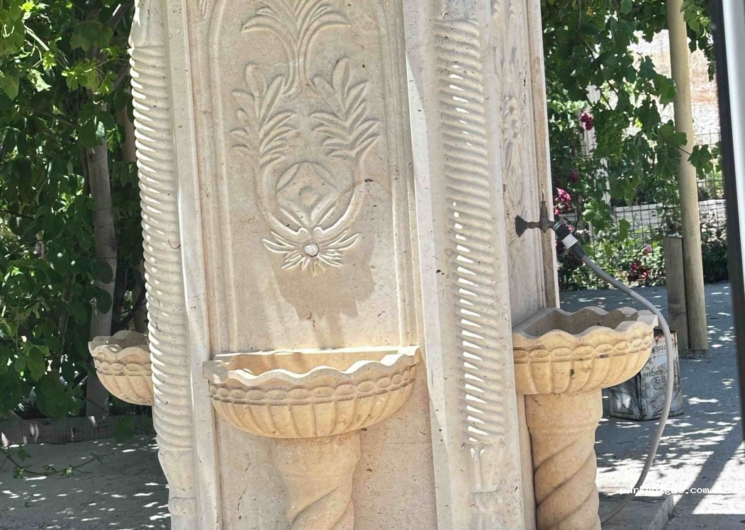 Grote parkeerplaats met een waterbron ernaast.