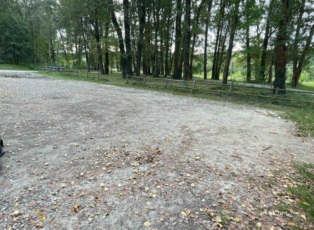 Gravel parking lot in the park. River nearby. For access, drive from the parking lot next to the road over a small bridge. There are picnic tables and bbq places. Bar with toilets next to the parking.