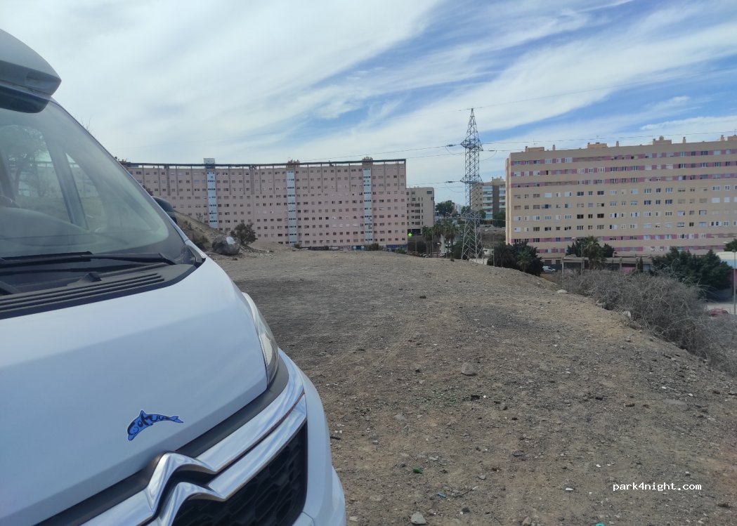 Unbefestigter Parkplatz mit Aussicht auf die Stadt und am Horizont das Meer,