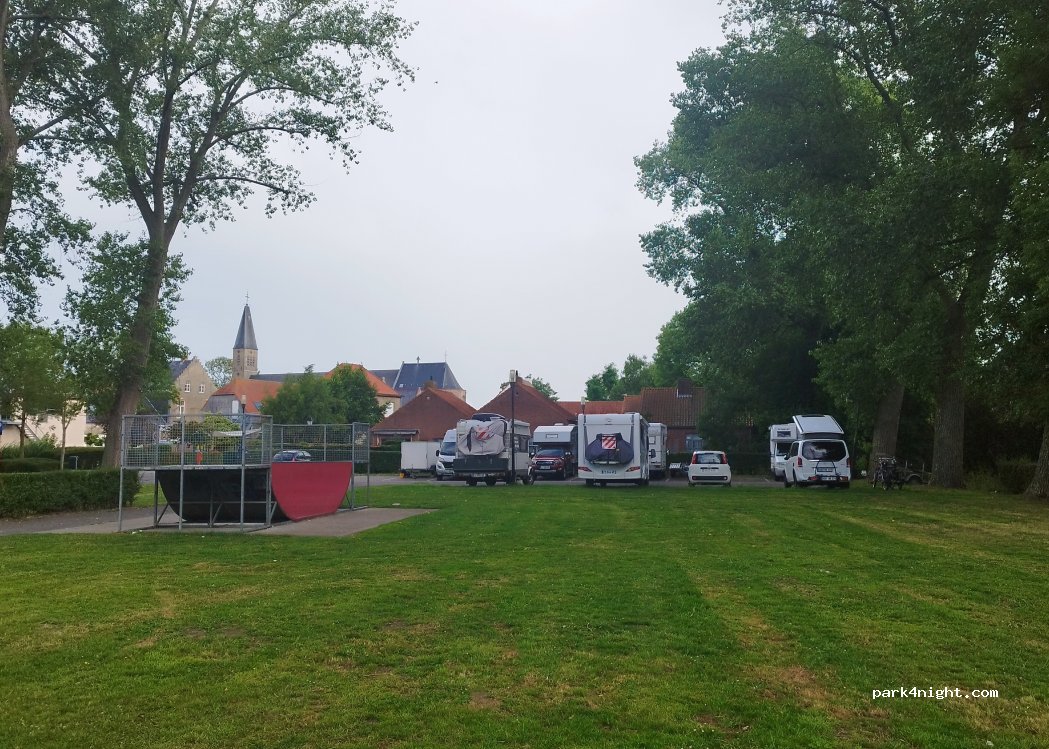 Amazing place to park very quiet in a local area and only a 10 minute bus into Bruges city centre. Small play park at this location and school but no noise at all. Not many shops so stock up. Great walks nearby and all in all very safe.