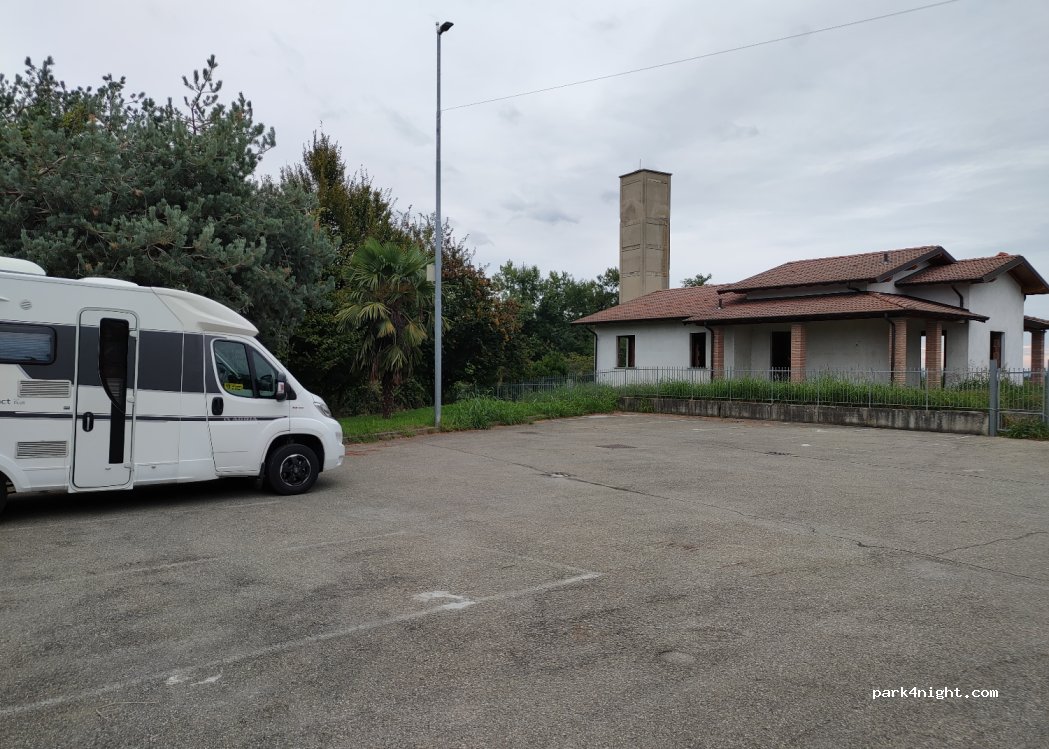 Piccolo parcheggio in fondo a un vicolo asfaltato con 8 posti auto, lontano da strade trafficate, con un piccolo giardino annesso dove si possono far correre i cani, in un quartiere residenziale, carino. Nessun servizio.