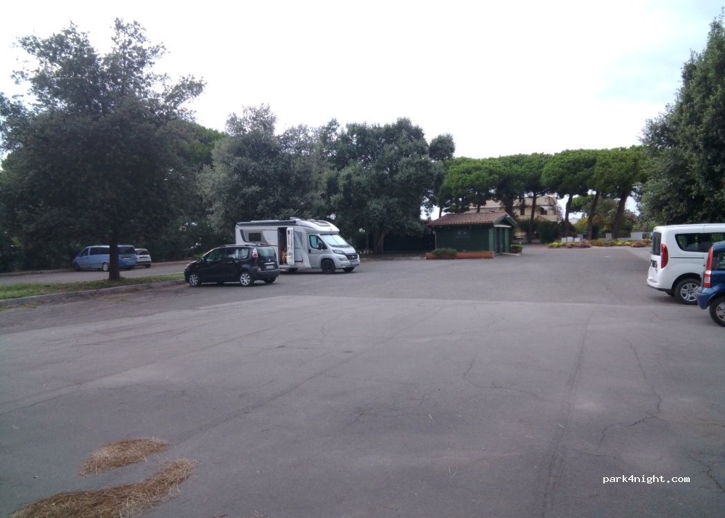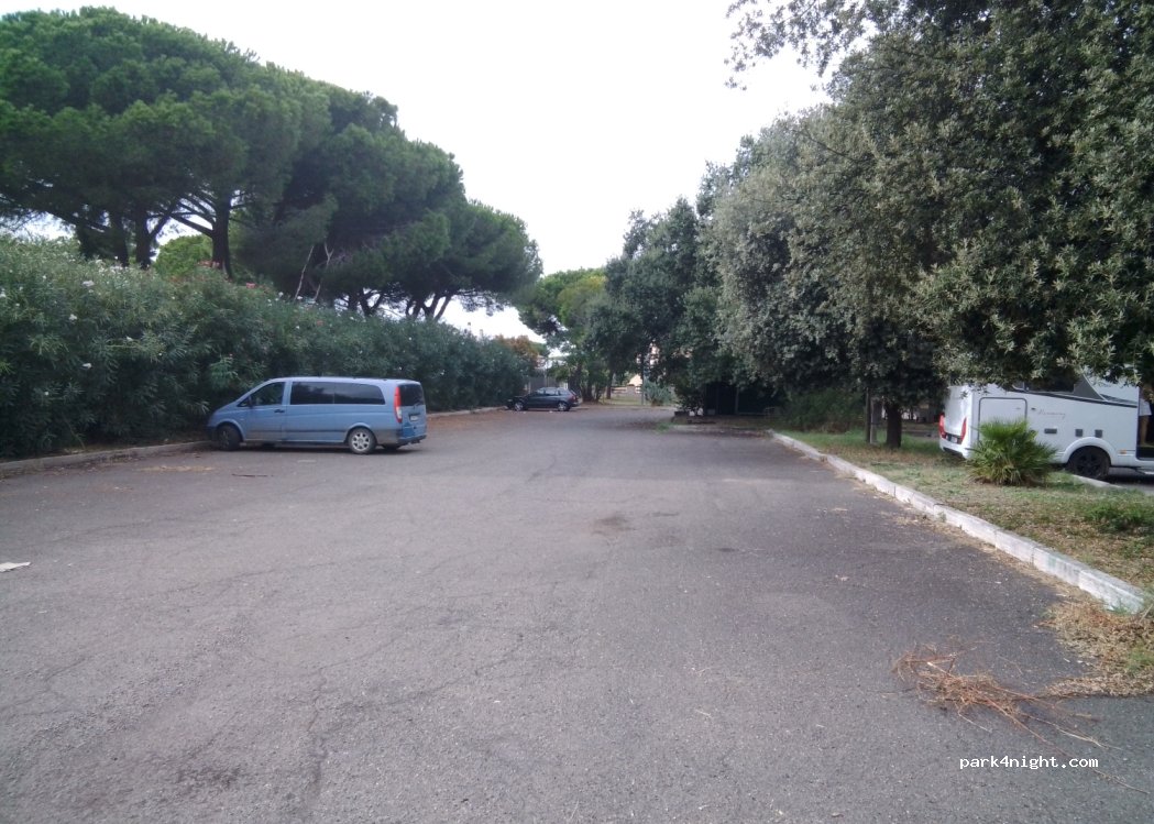 Ampio parcheggio custodito in zona residenziale. Senza restrizioni. Stavamo con la coda sul prato. Sulla piazza sono presenti due bancarelle in legno, attualmente chiuse.