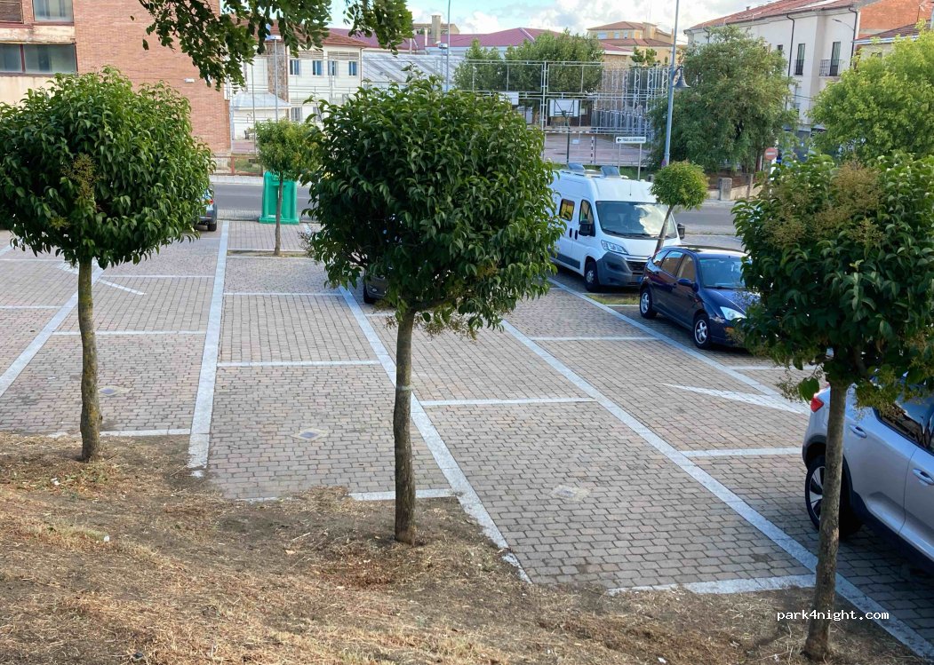Public parking with slightly sloping spaces, next to the city wall with access to the city and 150m from the main square. Not suitable for large motorhomes, ideal for small or medium-sized vans. On Saturday mornings there is a street market, parking is prohibited.