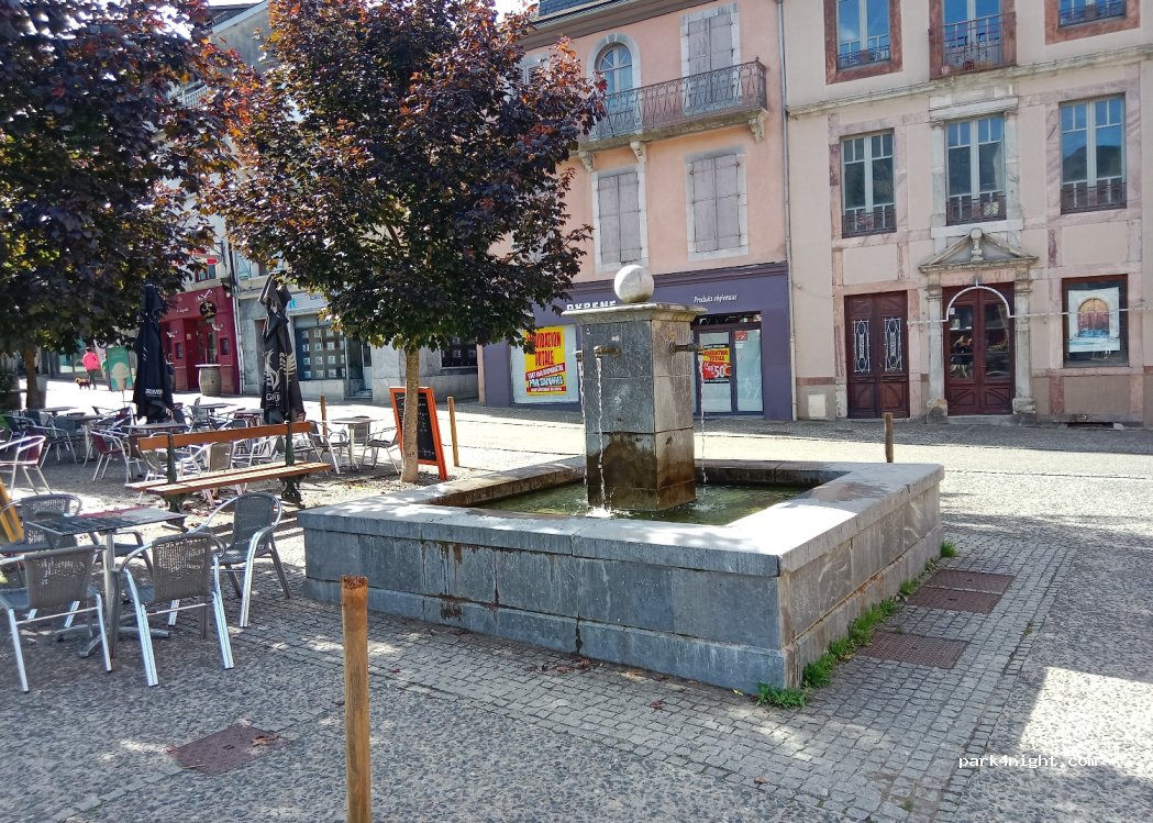 On a small square with parking. Public fountain with a good flow, bring a container to take the water, and stretch out your arms.