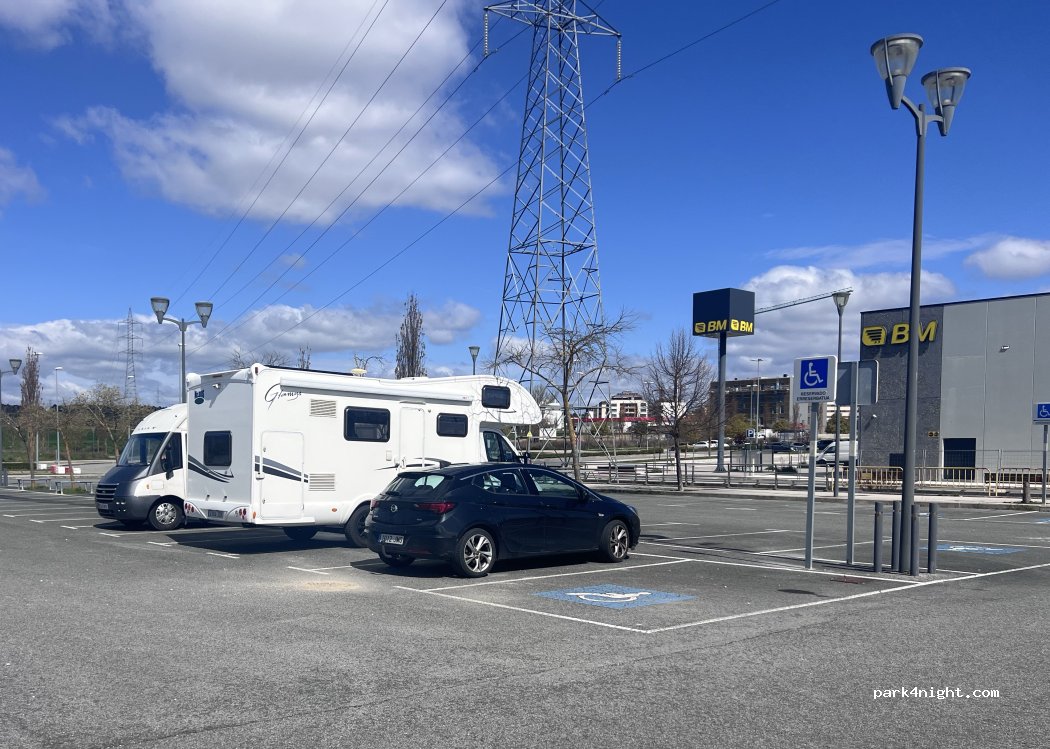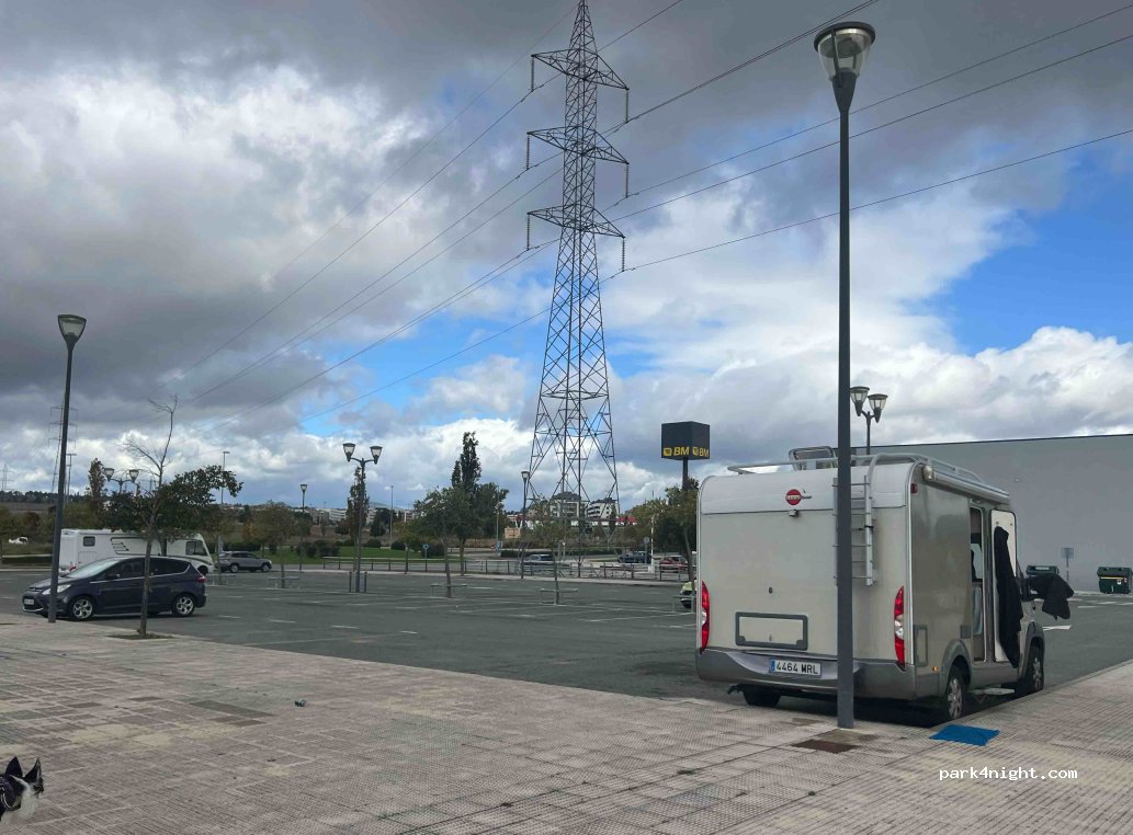 Parking next to a shopping area in Zizur mayor. Just one minute from the motorway, but you can't hear the motorway. Dog play area next door. Video-monitored shopping area. City bus to Pamplona 3 minutes walk away. Services for motorhomes at the Leclerc petrol station at the entrances.