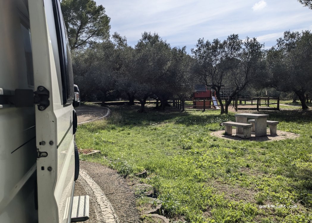 Motorway rest area with picnic area and children's playground set back from the road. Relatively flat places to park without being on top of others. Continuous motorway noise but for lunch break it's fine. It's up to you...