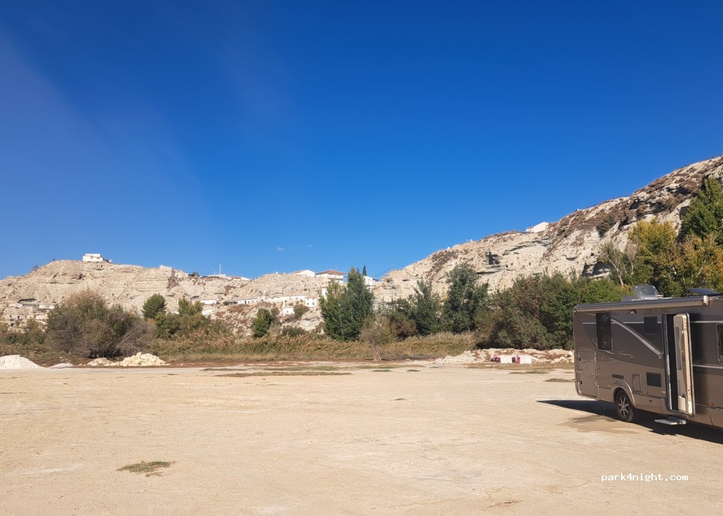 Large parking area, room for more than 10 large vehicles. It is not paved but is compacted. Good access to the town and to the hiking and cycling routes.