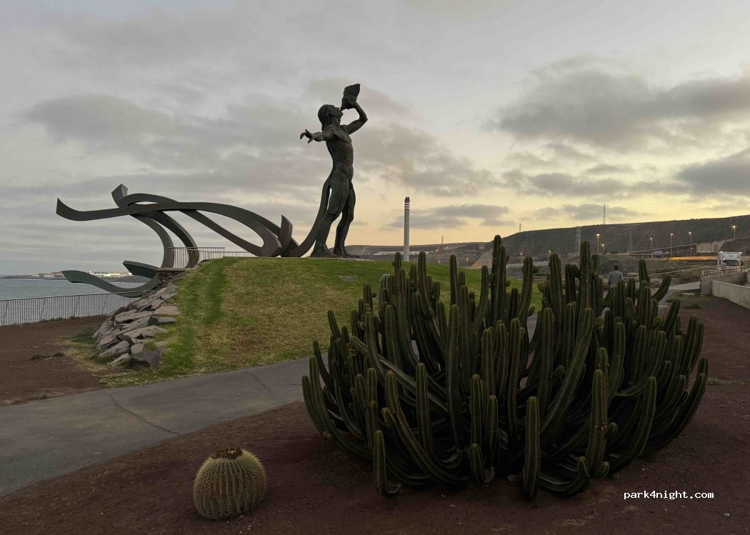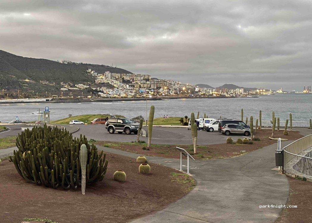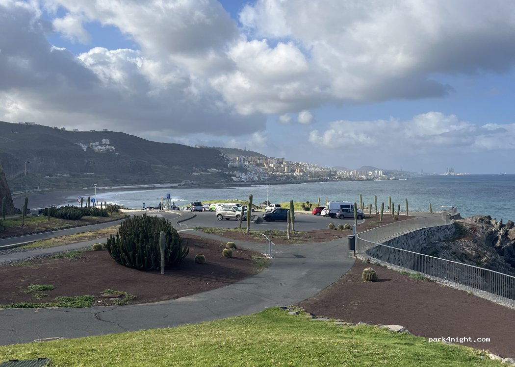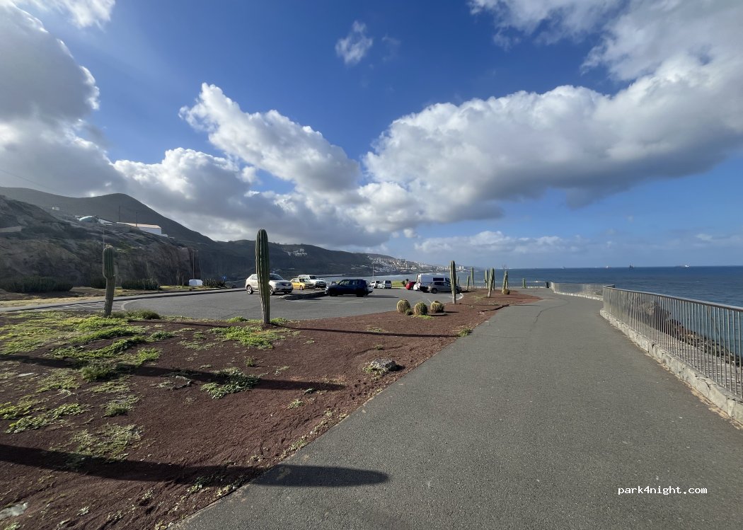 Parking asfaltado y plano con inclinación, para más de 60 vehículos, solo hay papeleras y parada de guagua a Las Palmas (que no es poco, ya que allí es casi imposible aparcar una camper de +2mt). Zonas de césped y playa (buena) a 250mt directamente con un escalera