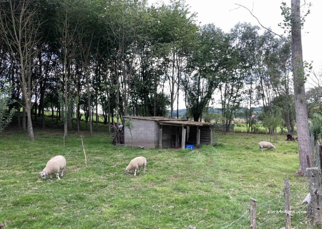 Goed verborgen plek bij een visvijver, weide met schapen en struisvogels. Lichtjes hellend en een beetje vochtige ondergrond. Prima voor één nacht, maar verder niet veel te beleven. Voorzie een muggennet!