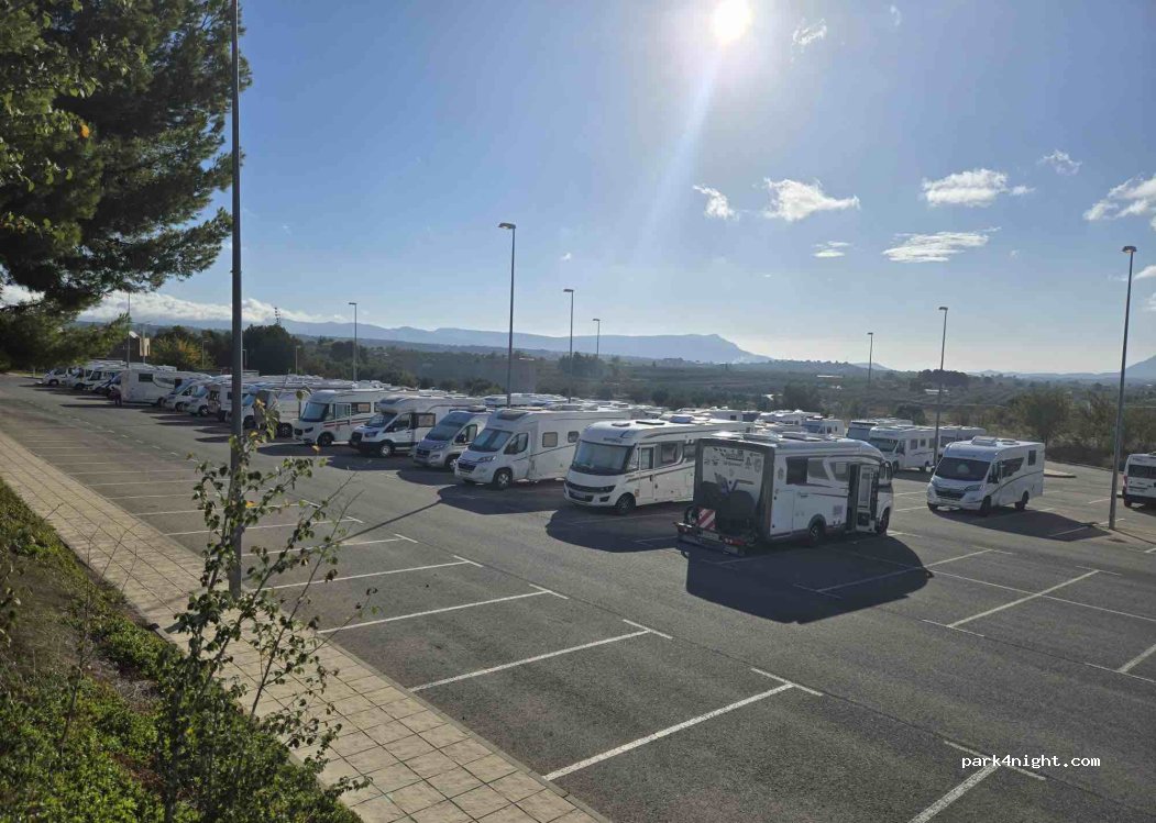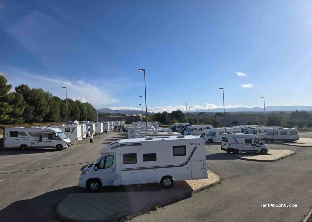 Useful large parking which is sometimes empty and sometimes absolutely full of motorhomes. Note, however, that the local police came by and told us off for walking our dog on a path at the edge of the zona deportiva. Lots of Spaniards from the town walk their dogs here, but apparently it's prohibited.