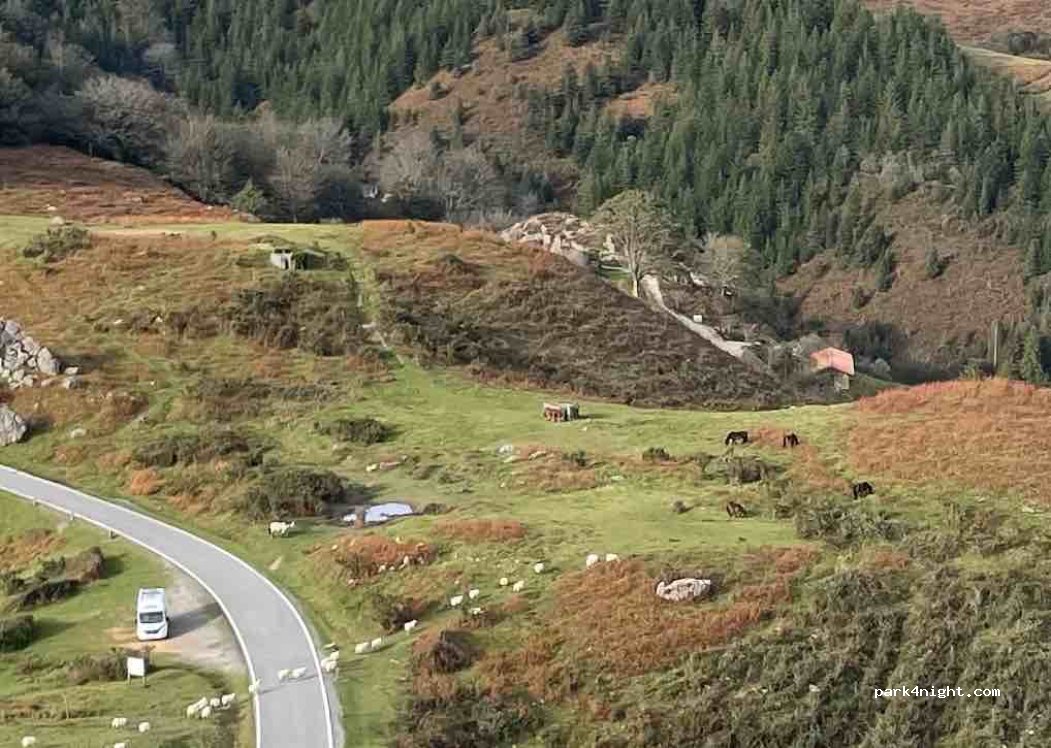 Kleiner unbefestigter Bereich am Straßenrand (Sackgasse). ziemlich flach. Nachts kein Lärm, Schafe und Pottok laufen frei herum.