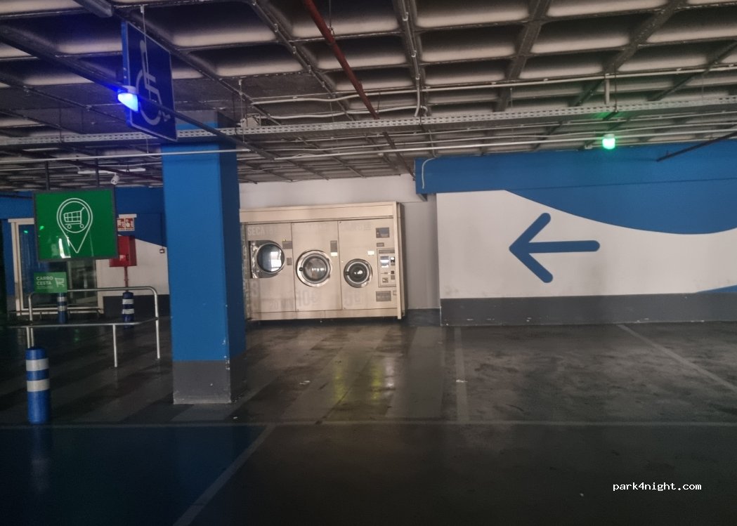 Ubicado en el aparcamiento de un centro comercial, en el segundo piso de un aparcamiento de varias tiendas (un nivel por debajo de la parte superior), en la parte trasera del aparcamiento cerca del lugar P-1 O-7 (ver foto tomada desde la entrada de vehículos). Lo visité el domingo y el aparcamiento estaba prácticamente vacío.