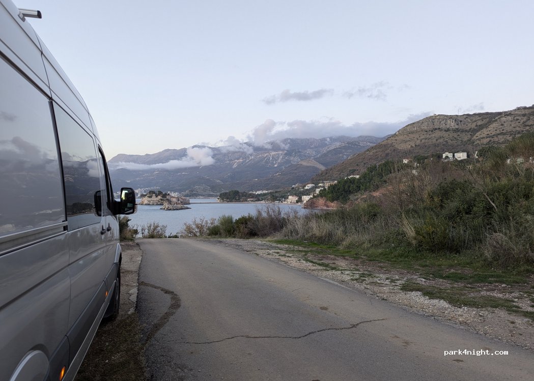 Mooi uitzicht over Sveti Stefan. 's Avonds enkele mannen die in hun auto rustig naar de zonsondergang kwamen kijken. Wij besloten uiteindelijk naar de p4n iets verderop te gaan omdat daar iets meer ruimte en privacy was.