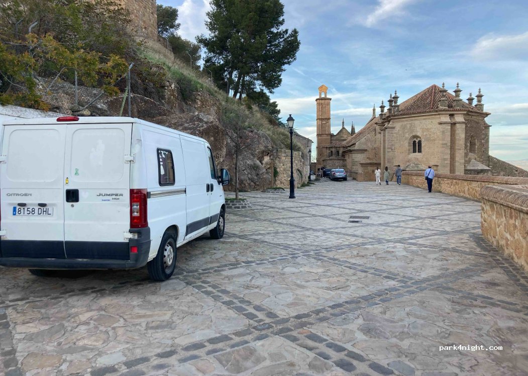 Parking spaces in a quiet dead end. Water at the foot of the castle. Be careful, the town is old and it goes up and down, the streets are not suitable for large camper vans. Max van 6m and 2m wide because of the 90 degree street.