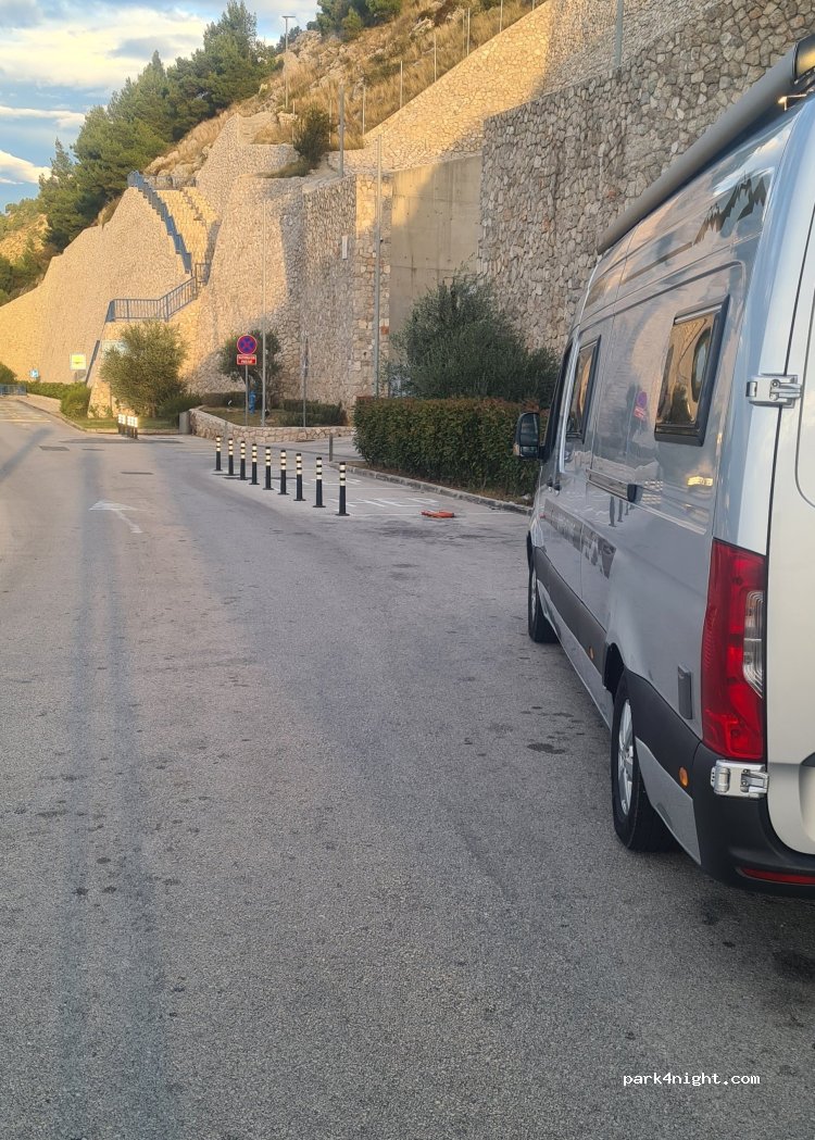 Free little spot just before bus stop on the slip road. We left our campervan and visited Dubrownik on two different days without any problem. Great start point for hiking to Dubrownik viewpoint. Space for two campervans.