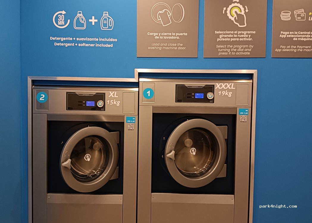 Washing 9kg/5€, 19kg/9€, drying 15kg/20min 3€