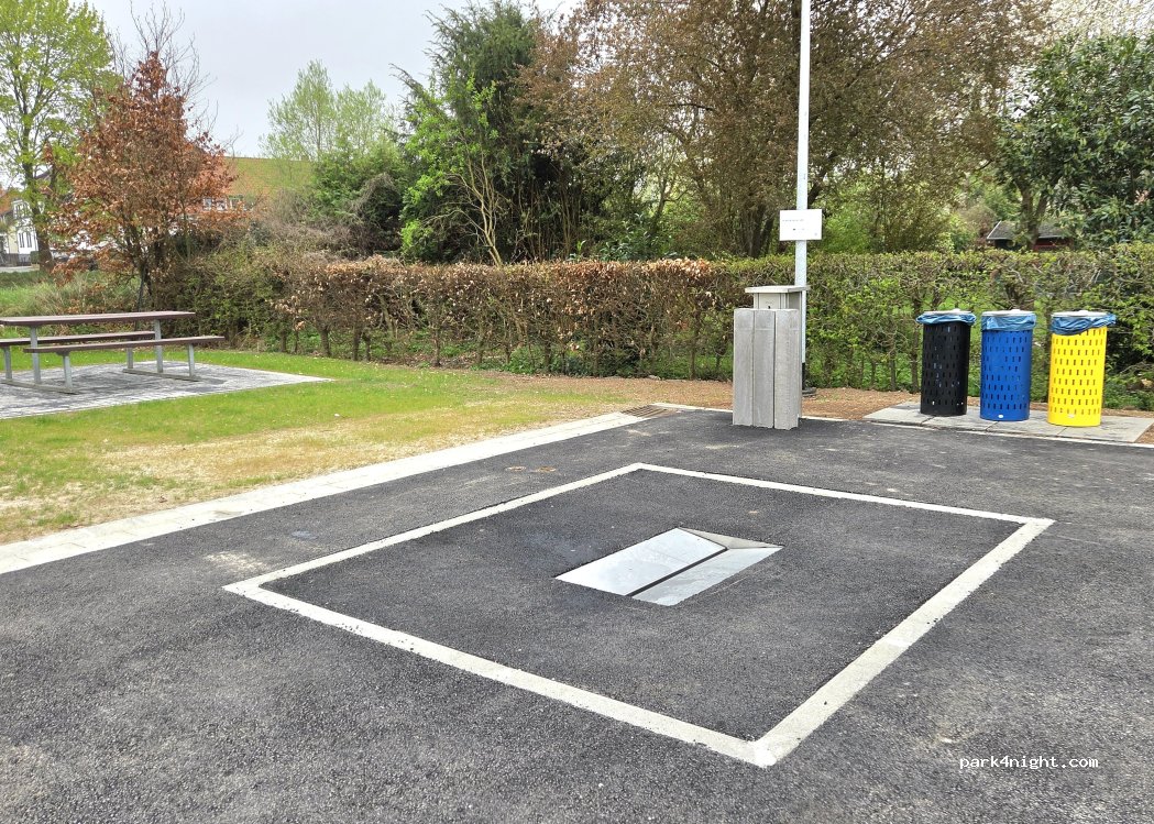 Prima voor 1 nacht! +Er zijn ca. 4 plaatsen +Vuilnisbakken +Grijs water legen +Water +Picknickbank +Supermarkt op loopafstand +Schoon -Erg drukke weg ervoor en dan bedoel ik ook echt druk! (En wij zijn wel wat gewend:)) Dank aan de gemeente voor deze gratis plek!!!;)