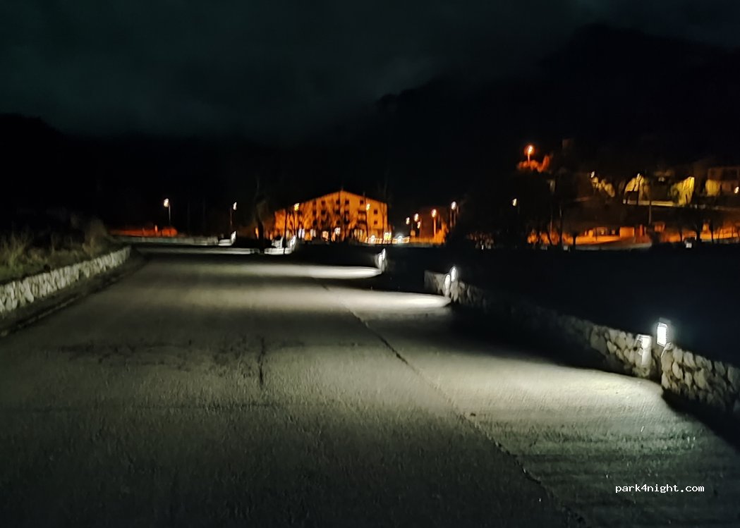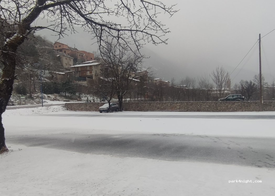 És asfaltat i pla. No hi hem pernoctat perquè teníem previst anar a Sant Llorenç, però ens hi hauríem pogut quedar perfectament: no hem vist cap senyal de prohibició. Recomanem comprar pa al forn que hi ha a la rotonda, a mà esquerra pujant cap al castell. És boníssim!